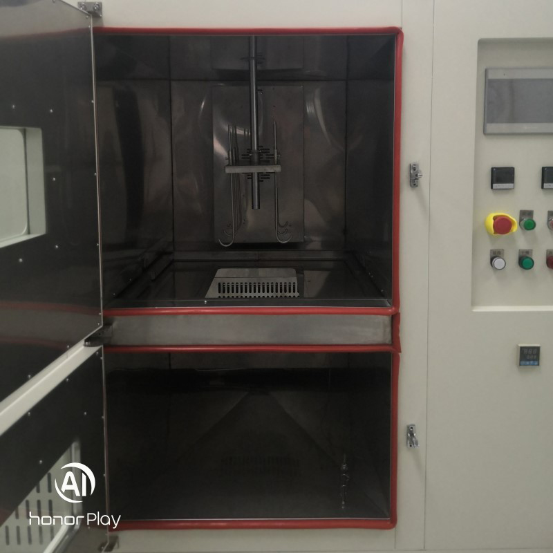 2.6. Den Prüfanforderungen entsprechend werden die Proben periodisch im Trockenofen getrocknet und in der Salztauchkammer getaucht. Vor jedem Zyklus werden die Betriebstemperaturen des Trockenofens und der Salztauchkammer individuell eingestellt und die jeweiligen Temperaturkontrollsysteme aktiviert. Sobald die Kammern die erforderlichen Arbeitstemperaturen erreicht haben, werden die Trocknungsdauer (z. B. 50 Minuten) und die Eintauchdauer (z. B. 20 Minuten) konfiguriert, gefolgt von der Ein- und Aktivierung ihrer jeweiligen Temperaturkontrollsysteme. Sobald die Kammern die erforderliche Betriebstemperatur erreicht haben, stellen Sie die Trocknungsdauer (z. B. 50 Minuten) und die Eintauchdauer (z. B. 20 Minuten) sowie die Anzahl der Zyklen ein. Drücken Sie die Starttaste (unter normalen Bedingungen befindet sich das Probenrack in der Trockenkammer). Anschließend werden die Prüflinge gemäß dem programmierten Zeitplan regelmäßigen Trocknungs- und Eintauchzyklen unterzogen. Nach Ablauf der Trocknungszeit (z. B. 50 Minuten) öffnet sich die Trenntür zwischen Trocknungs- und Tauchkammer. Die oben auf der Kammer positionierte elektrische Schubstange senkt dann den Prüfling in die Tauchkammer. Gleichzeitig dichtet die Abdeckung oben an der Schubstange den Probendurchgang ab und isoliert so die obere und untere Kammer. Wenn die Eintauchzeit (z. B. 20 Minuten) abgelaufen ist, hebt die elektrische Schubstange die Probe zurück in die Trockenkammer. Anschließend schließt sich die Zwischentür automatisch und isoliert die beiden Kammern wieder. Diese Sequenz stellt einen Zyklus dar, der sich entsprechend der voreingestellten Anzahl von Zyklen wiederholt, bis der Test abgeschlossen ist. Darüber hinaus darf die Zeit, die für das vollständige Eintauchen oder Herausholen jeder Probe benötigt wird, 2 Minuten nicht überschreiten. Um besonderen Anforderungen gerecht zu werden, ist dieses Gerät außerdem mit separaten Öffnungs- und Schließtasten für die Zwischentür ausgestattet. Der Probenhalter verfügt außerdem über einen Momentanhebeknopf, mit dem die Probe je nach Betriebsbedarf angehoben oder abgesenkt werden kann.